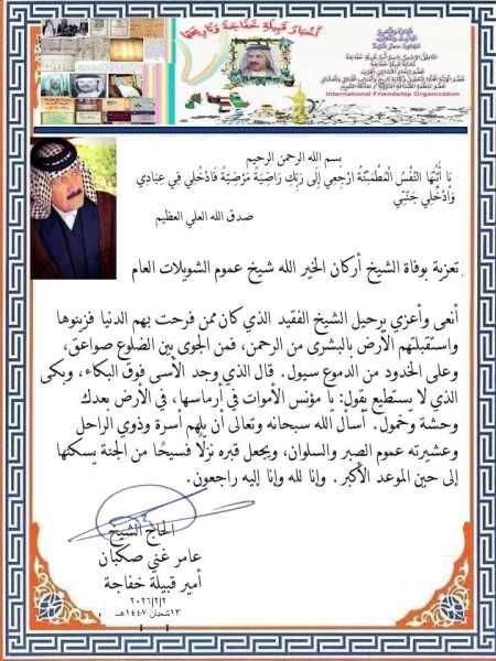 تعزية بوفاة الشيخ أركان الخير الله شيخ عموم الشويلات العام
