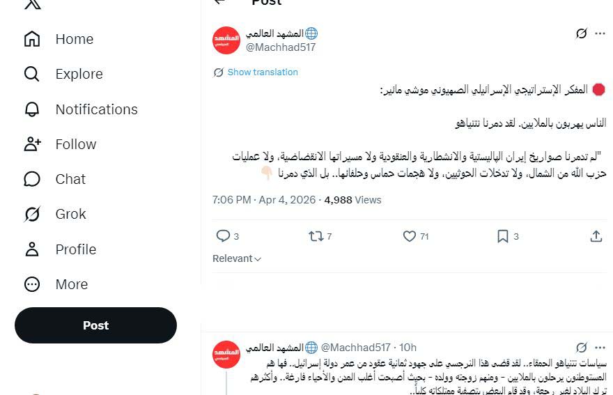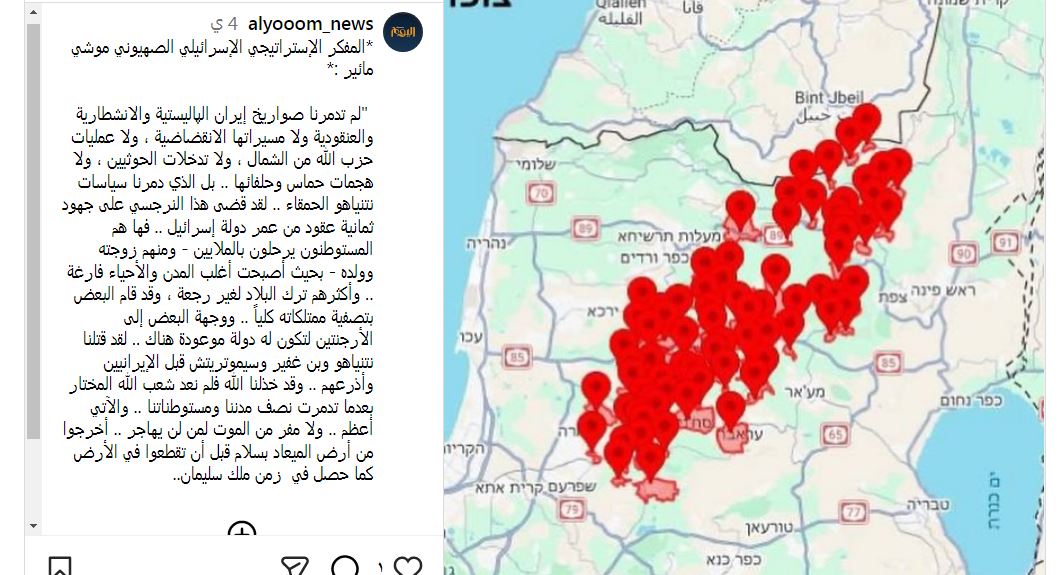 " .. لم تدمرنا صواريخ إيران الپاليستية والانشطارية والعنقودية ولا مسيراتها الانقضاضية ، ولا عمليات حزب الله من الشمال ، ولا تدخلات الحوثيين ، ولا هجمات حماس وحلفائها .. بل الذي دمرنا سياسات نتنياهو الحمقاء .. لقد قضى هذا النرجسي على جهود ثمانية عقود من عمر دولة إسرائيل .. فها هم المستوطنون يرحلون بالملايين - ومنهم زوجته وولده - بحيث أصبحت أغلب المدن والأحياء فارغة .. وأكثرهم ترك البلاد لغير رجعة ، وقد قام البعض بتصفية ممتلكاته كلياً .. ووجهة البعض إلى الأرجنتين لتكون له دولة موعودة هناك .. لقد قتلنا نتنياهو وبن غفير وسيموتريتش قبل الإيرانيين وأذرعهم .. وقد خذلنا الله فلم نعد شعب الله المختار بعدما تدمرت نصف مدننا ومستوطناتنا .. والآتي أعظم .. ولا مفر من الموت لمن لن يهاجر .. أخرجوا من أرض الميعاد بسلام قبل أن تقطعوا في الأرض كما حصل في زمن ملك سليمان