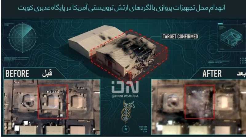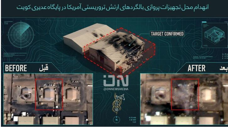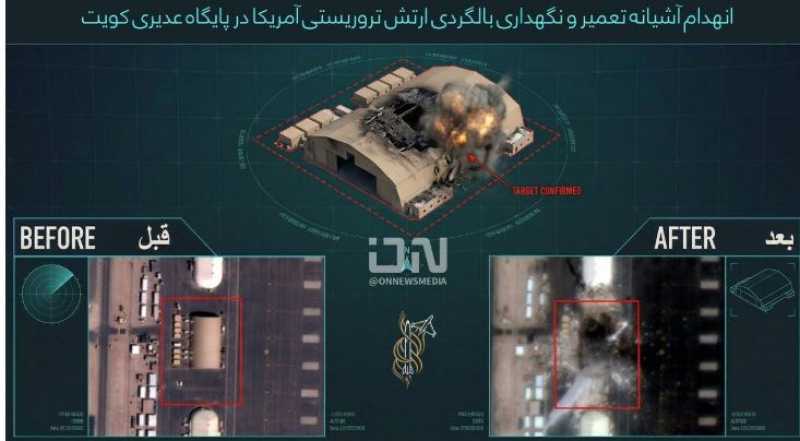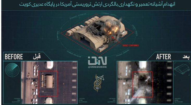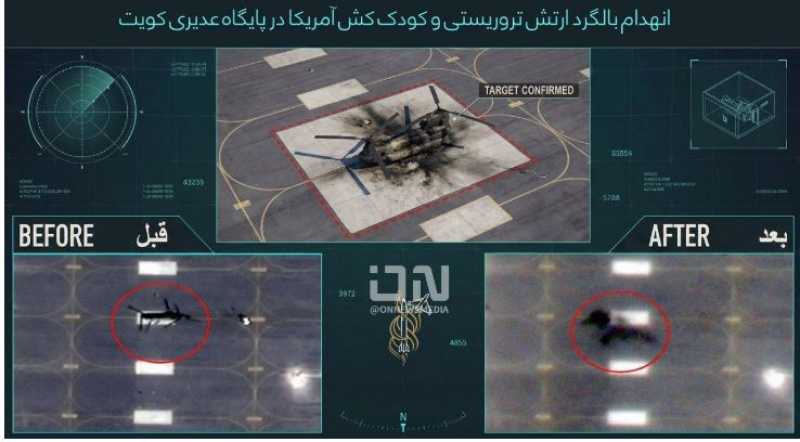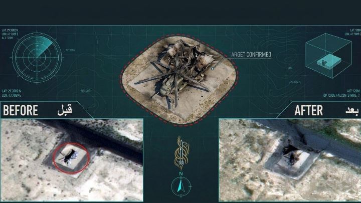 أظهرت صور أقمار اصطناعية جديدة الدمار والضرر الذي لحق بالمروحيات وهناكر الدعم والتجهيز للمروحيات الأمريكية في قاعدة العديري في الكويت، إضافة إلى أضرار في قواعد الدعم الاستخباراتي والمعلوماتي للجيش الأمريكي في البحرين.