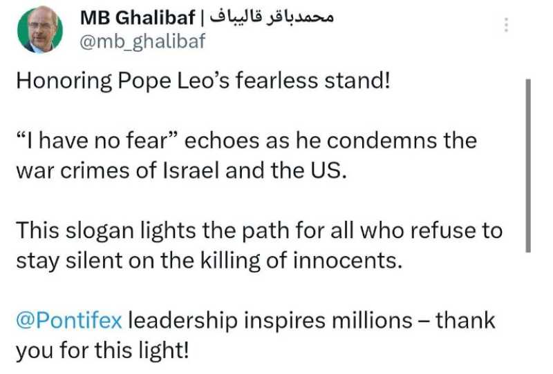 وقال قاليباف في رسالته: “تقديراً لصمودكم الشجاع، أيها البابا ليو، بإدانة جرائم الحرب الإسرائيلية والأمريكية، يتردد صدى شعار البابا: أنا لا أخاف شيئاً”.