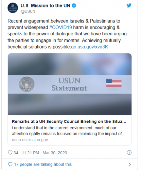 وأشاد مسؤولو الأمم المتحدة في الأيام الأخيرة بالتعاون “غير المسبوق” و”الممتاز” بين اسرائيل ورام الله في مكافحة الفيروس القاتل، والذي يتضمن تخفيف القيود على حرية التنقل وتسهيل الدورات التدريبية للموظفين الطبيين الفلسطينيين، وكذلك قيام وزارة الصحة الإسرائيلية بالتبرع بآلاف أجهزة الفحص للكشف عن الفيروس التاجي ومعدات حماية شخصية.