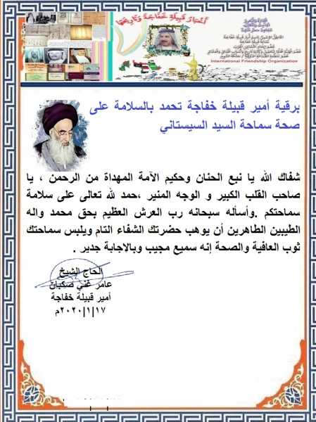 برقية أمير قبيلة خفاجة تحمد بالسلامة على صحة سماحة السيد