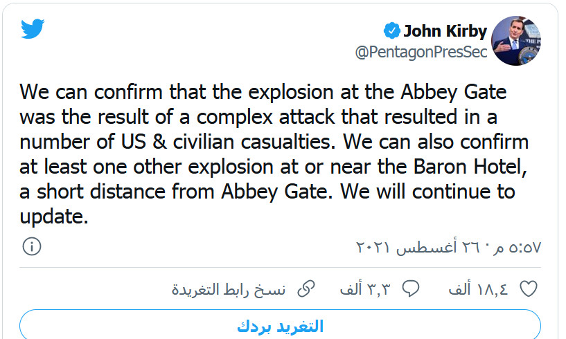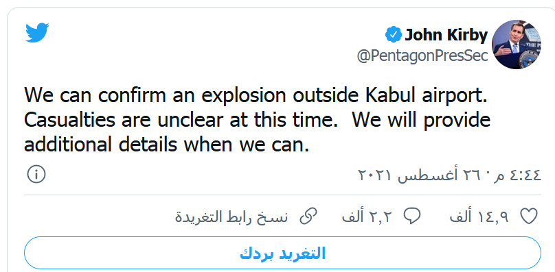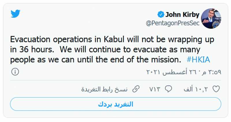 وقال جون كيربي في تغريدة أن «عمليات الإجلاء في كابل لن تنتهي في 36 ساعة. سنواصل إجلاء أكبر عدد ممكن من الأشخاص حتى انتهاء المهمة».