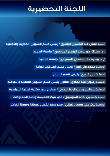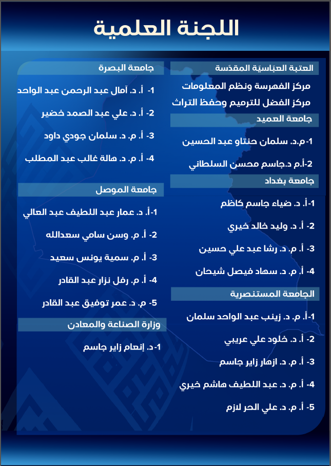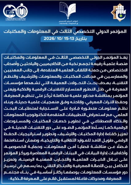 يقيم المؤتمر مركز الفهرسة ونظم المعلومات ومركز الفضل لصيانة وحفظ التراث التابعان لمكتبة ودار مخطوطات العتبة العباسية المقدسة في القسم، بالتعاون مع جامعة العميد، وبالشراكة العلمية مع كلية الذكاء الاصطناعي في جامعة بغداد، إضافةً إلى أقسام المعلومات وتقنيات المعرفة في كل من الجامعة المستنصرية، وجامعة البصرة، وجامعة الموصل، تحت شعار: «ريادة المعرفة: قيادة المستقبل»، وذلك في الفترة من 13 إلى 15 / 10 / 2026م.