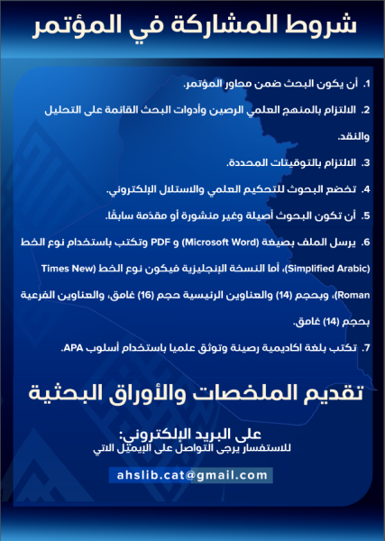 ترسل الملخصات والبحوث إلى البريد الإلكتروني التالي: ahslib.cat@gmail.com