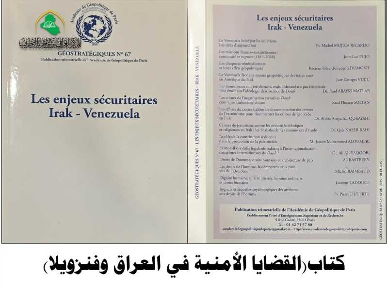 شارك قسمُ الشؤونِ الفكرية والثقافية في العتبة العباسية المقدسة، ممثَّلًا بالمركز العراقي لتوثيق جرائم التطرّف، في إصدار كتابٍ علميٍّ باللغة الفرنسية عن أكاديمية الجيوبوليتيك في باريس، حمل عنوان "القضايا الأمنية في العراق وفنزويلا".